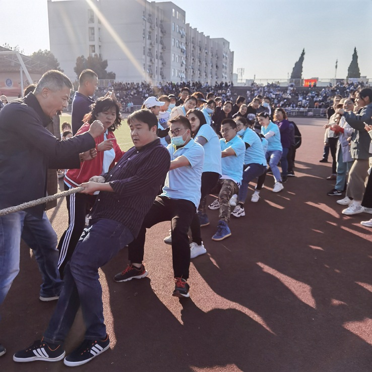 在压轴大戏拔河对抗赛的赛场上,全校七支代表队,通过抽签决定对手。裁判员挥动手中的旗子喊道:“预备,开始!”激烈的比赛正式开始了。只见大家都卯足了劲,有的鼓着腮帮,脸憋得通红;有的身体往后倒,都快坐到地上了。绑在绳子中间的红丝带一会儿往左,一会儿往右。啦啦队蹦着跳着高声喊:“加油!加油!”选手们互不相让,累得满头大汗。经过努力拼搏最后行政教辅荣获第一名,软件工程系和食品工程系位列第二名第三名。