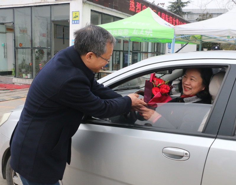 3月8日清晨6时50分许,党委委员、工会主席吴志华,党委委员、组织人事处处长张程刚手握承载着殷切关怀的花束,静候在学校一号门的门口,把盛开的鲜花送到每一位前来上班的女教职工手中,把最真诚的祝福送到每位女教职工的心中。